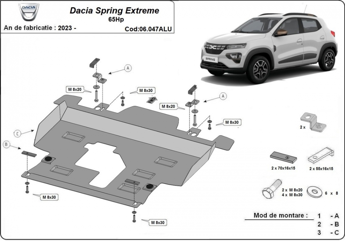 The sump guard is new and fits perfectly for all versions of Dacia Spring manufactured between 2023 and 2026. Sump guard for the protection of the: engine, gearbox, radiator Made out of 4 mm thick Aluminium plate. The shields are made of aluminum, but the mounting brackets are made of steel. Screws, nuts, clips, all fastening accessories are included. All sump guards are powder coated to prevent corrosion. The exterior of the sump guard is provided with Aluminium reinforcements, which increases the resistance to impact. |