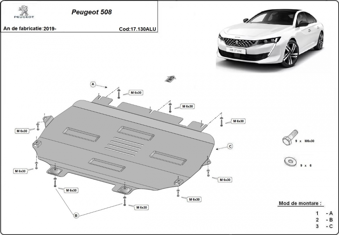 The sump guard is new and fits perfectly for all versions of Peugeot 508 manufactured between 2019 and 2026. Sump guard for the protection of the: engine, gearbox, radiator, front bumper Made out of 3 mm thick Aluminium plate. The shields are made of aluminum, but the mounting brackets are made of steel. Screws, nuts, clips, all fastening accessories are included. All sump guards are powder coated to prevent corrosion. The exterior of the sump guard is provided with Aluminium reinforcements, which increases the resistance to impact. |