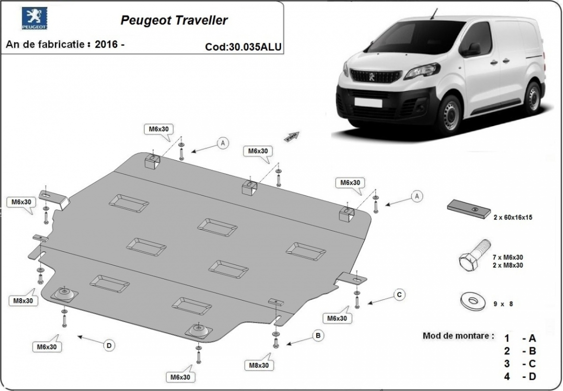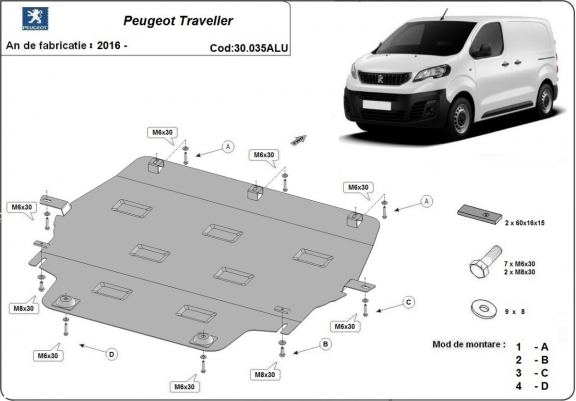 The sump guard is new and fits perfectly for all versions of Peugeot Traveller manufactured between 2016 and 2026. Sump guard for the protection of the: engine, gearbox, radiator Made out of 3 mm thick Aluminium plate. The shields are made of aluminum, but the mounting brackets are made of steel. Screws, nuts, clips, all fastening accessories are included. All sump guards are powder coated to prevent corrosion. The exterior of the sump guard is provided with Aluminium reinforcements, which increases the resistance to impact. |