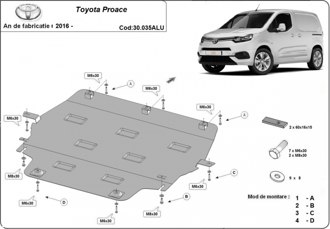 The sump guard is new and fits perfectly for all versions of Toyota Proace manufactured between 2016 and 2026. Sump guard for the protection of the: engine, gearbox, radiator Made out of 3 mm thick Aluminium plate. The shields are made of aluminum, but the mounting brackets are made of steel. Screws, nuts, clips, all fastening accessories are included. All sump guards are powder coated to prevent corrosion. The exterior of the sump guard is provided with Aluminium reinforcements, which increases the resistance to impact. |