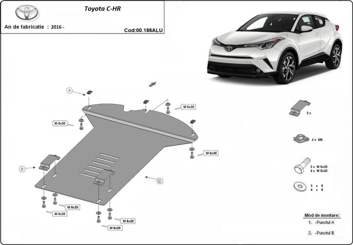 The sump guard is new and fits perfectly for all versions of Toyota C-HR manufactured between 2016 and 2023. Sump guard for the protection of the: Catalytic converter Made out of 3 mm thick Aluminium plate. The shields are made of aluminum, but the mounting brackets are made of steel. Screws, nuts, clips, all fastening accessories are included. All sump guards are powder coated to prevent corrosion. The exterior of the sump guard is provided with Aluminium reinforcements, which increases the resistance to impact. |