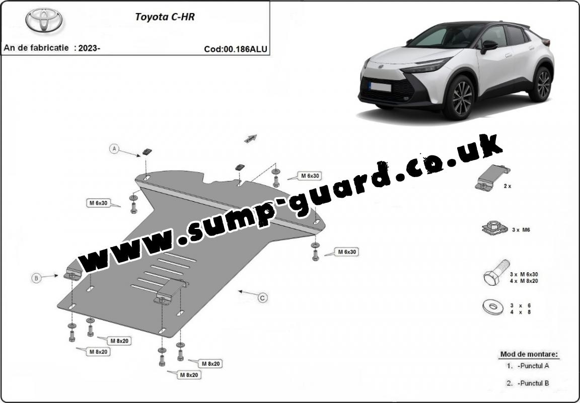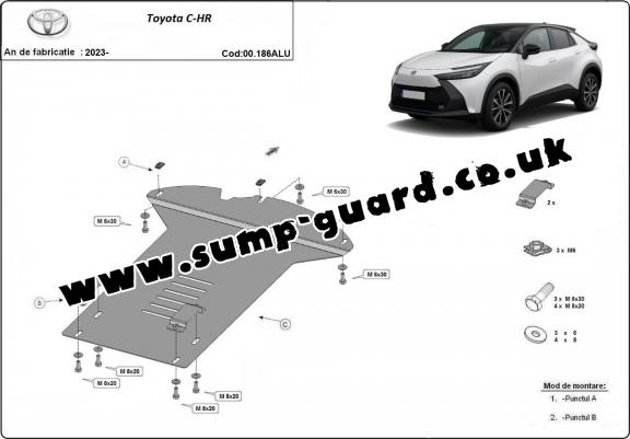 The sump guard is new and fits perfectly for all versions of Toyota C-HR manufactured between 2023 and 2025. Sump guard for the protection of the: Catalytic converter Made out of 3 mm thick Aluminium plate. The shields are made of aluminum, but the mounting brackets are made of steel. Screws, nuts, clips, all fastening accessories are included. All sump guards are powder coated to prevent corrosion. The exterior of the sump guard is provided with Aluminium reinforcements, which increases the resistance to impact. |