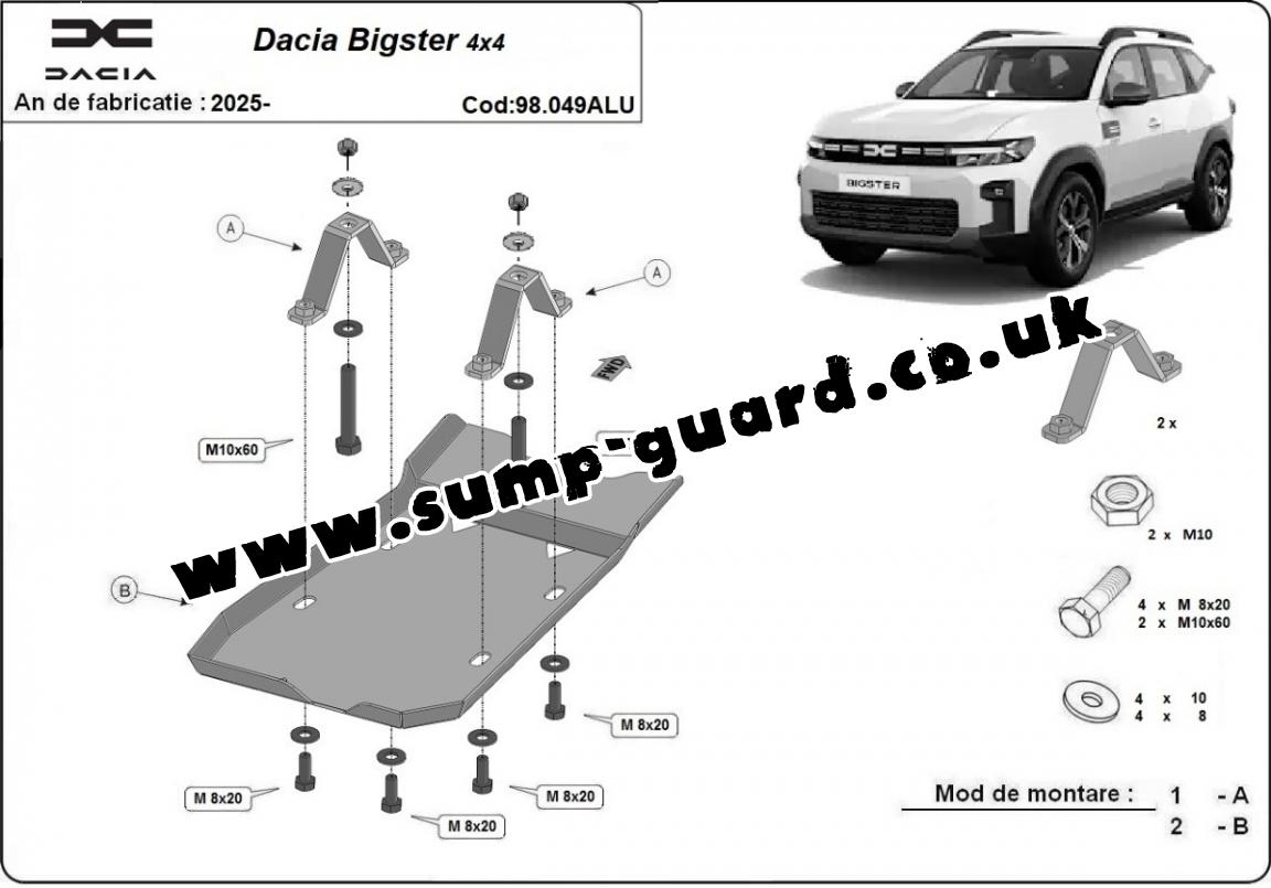 The sump guard is new and fits perfectly for all versions of Dacia Bigster manufactured between 2025 and 2025. Sump guard for the protection of the: differential Made out of 4 mm thick Aluminium plate. The shields are made of aluminum, but the mounting brackets are made of steel. Screws, nuts, clips, all fastening accessories are included. All sump guards are powder coated to prevent corrosion. The exterior of the sump guard is provided with Aluminium reinforcements, which increases the resistance to impact. |
