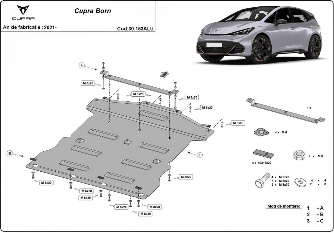 The sump guard is new and fits perfectly for all versions of Cupra Born manufactured between 2021 and 2026. Sump guard for the protection of the: engine, gearbox, radiator Made out of 3 mm thick Aluminium plate. The shields are made of aluminum, but the mounting brackets are made of steel. Screws, nuts, clips, all fastening accessories are included. All sump guards are powder coated to prevent corrosion. The exterior of the sump guard is provided with Aluminium reinforcements, which increases the resistance to impact. |