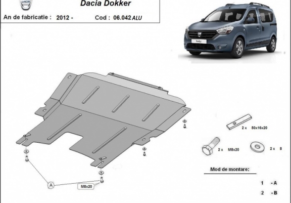 The sump guard is new and fits perfectly for all versions of Dacia Dokker manufactured between 2012 and 2026. Sump guard for the protection of the: engine, gearbox Made out of 4 mm thick Aluminium plate. The shields are made of aluminum, but the mounting brackets are made of steel. Screws, nuts, clips, all fastening accessories are included. All sump guards are powder coated to prevent corrosion. The exterior of the sump guard is provided with Aluminium reinforcements, which increases the resistance to impact. |