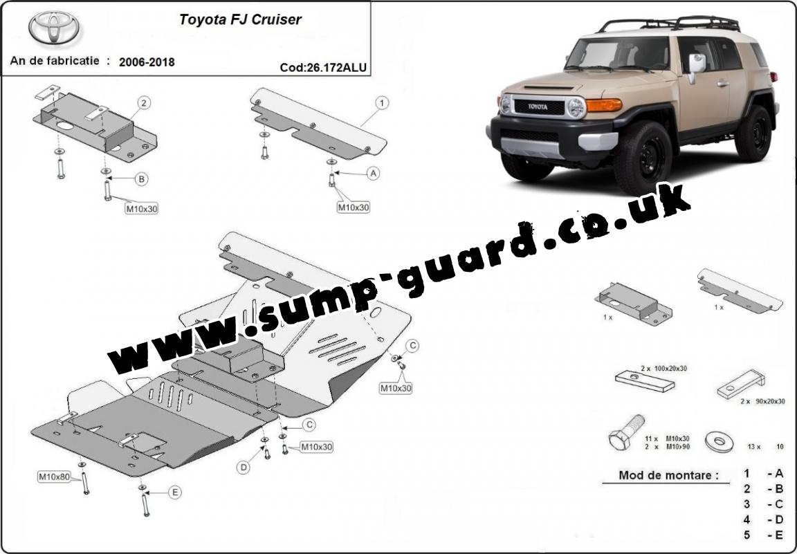 The sump guard is new and fits perfectly for all versions of FJ Cruiser manufactured between 2006 and 2018. Sump guard for the protection of the: engine, radiator, front bumper Made out of 4 mm thick Aluminium plate. The shields are made of aluminum, but the mounting brackets are made of steel. Screws, nuts, clips, all fastening accessories are included. All sump guards are powder coated to prevent corrosion. The exterior of the sump guard is provided with Aluminium reinforcements, which increases the resistance to impact. |