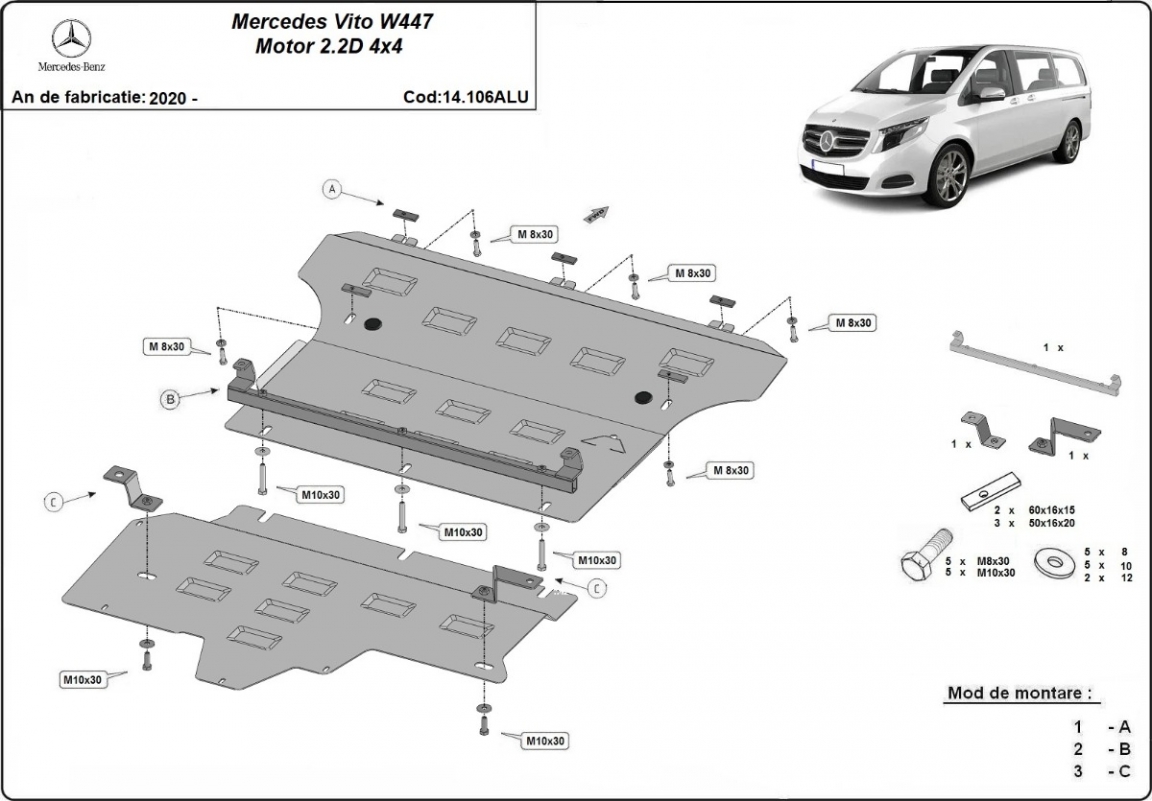 The sump guard is new and fits perfectly for the Mercedes Vito W447, with the following engine/drive versions: 2.0, 2.2 D, 4x4 - manufactured between 2020 and 2026. Sump guard for the protection of the: engine, gearbox, radiator Made out of 3 mm thick Aluminium plate. The shields are made of aluminum, but the mounting brackets are made of steel. Screws, nuts, clips, all fastening accessories are included. All sump guards are powder coated to prevent corrosion. The exterior of the sump guard is provided with Aluminium reinforcements, which increases the resistance to impact. |