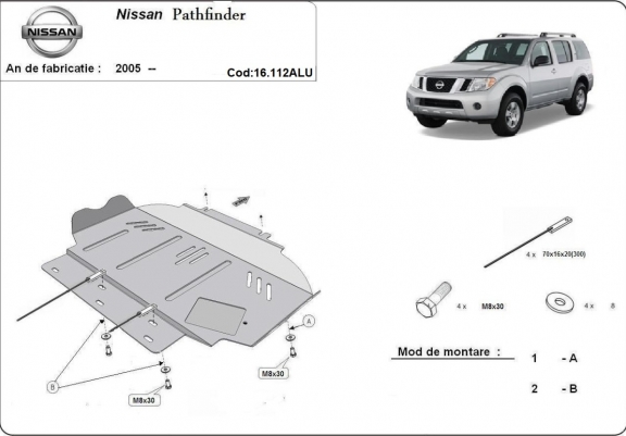 The sump guard is new and fits perfectly for all versions of Nissan Pathfinder manufactured between 2005 and 2026. Sump guard for the protection of the: engine Made out of 4 mm thick Aluminium plate. The shields are made of aluminum, but the mounting brackets are made of steel. Screws, nuts, clips, all fastening accessories are included. All sump guards are powder coated to prevent corrosion. The exterior of the sump guard is provided with Aluminium reinforcements, which increases the resistance to impact. |