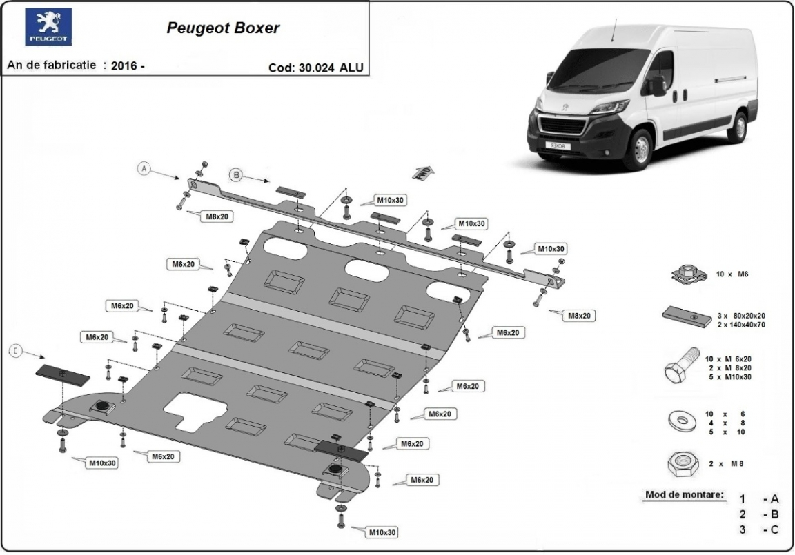 The sump guard is new and fits perfectly for all versions of Peugeot Boxer manufactured between 2016 and 2026. Sump guard for the protection of the: engine, gearbox, radiator Made out of 4 mm thick Aluminium plate. The shields are made of aluminum, but the mounting brackets are made of steel. Screws, nuts, clips, all fastening accessories are included. All sump guards are powder coated to prevent corrosion. The exterior of the sump guard is provided with Aluminium reinforcements, which increases the resistance to impact. |