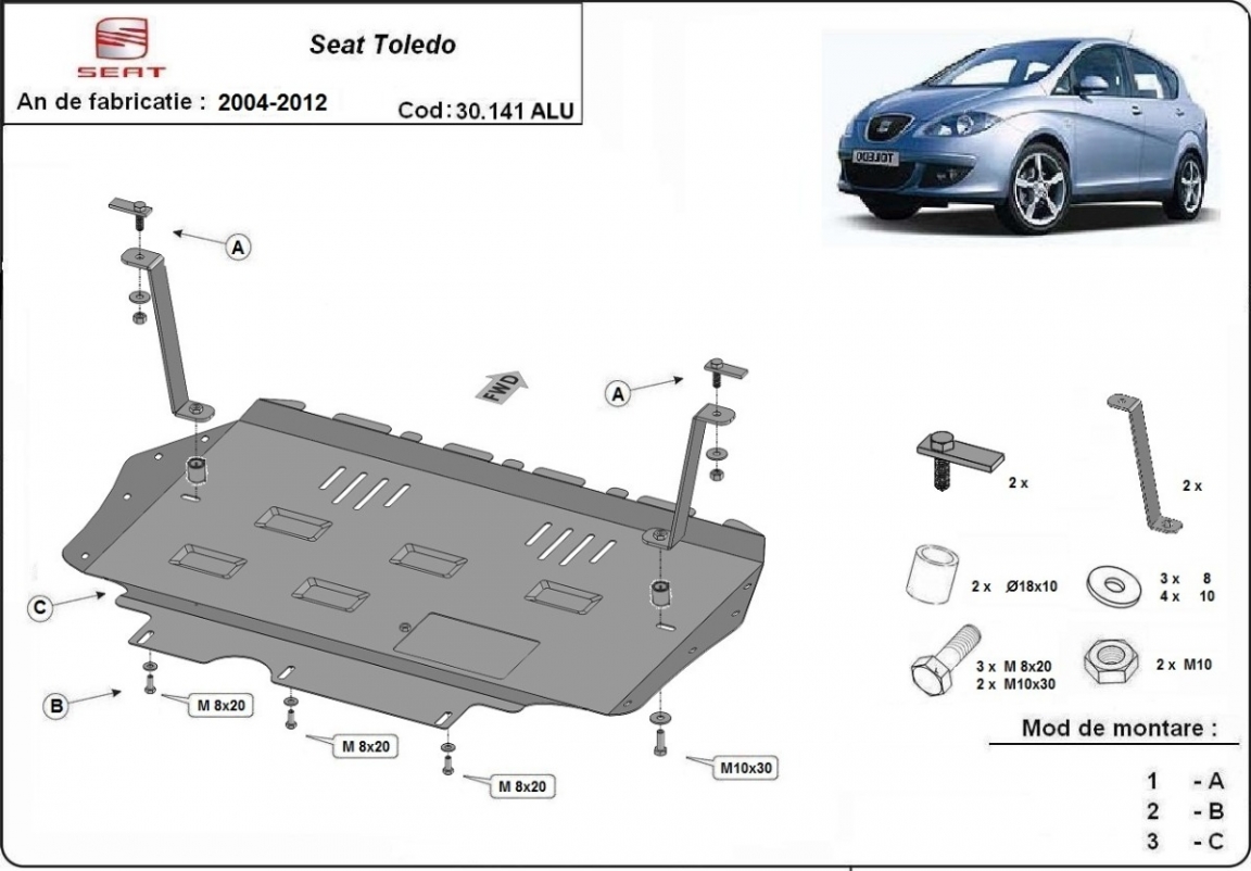 The sump guard is new and fits perfectly for all versions of Aluminum Toledo 3 manufactured between 2004 and 2012. Sump guard for the protection of the: engine, gearbox, radiator Made out of 3 mm thick Aluminium plate. The shields are made of aluminum, but the mounting brackets are made of steel. Screws, nuts, clips, all fastening accessories are included. All sump guards are powder coated to prevent corrosion. The exterior of the sump guard is provided with Aluminium reinforcements, which increases the resistance to impact. |