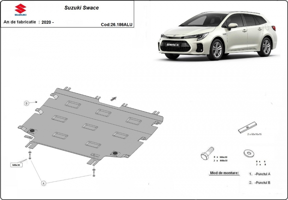 The sump guard is new and fits perfectly for all versions of Suzuki Swace manufactured between 2020 and 2026. Sump guard for the protection of the: engine, gearbox Made out of 3 mm thick Aluminium plate. The shields are made of aluminum, but the mounting brackets are made of steel. Screws, nuts, clips, all fastening accessories are included. All sump guards are powder coated to prevent corrosion. The exterior of the sump guard is provided with Aluminium reinforcements, which increases the resistance to impact. |