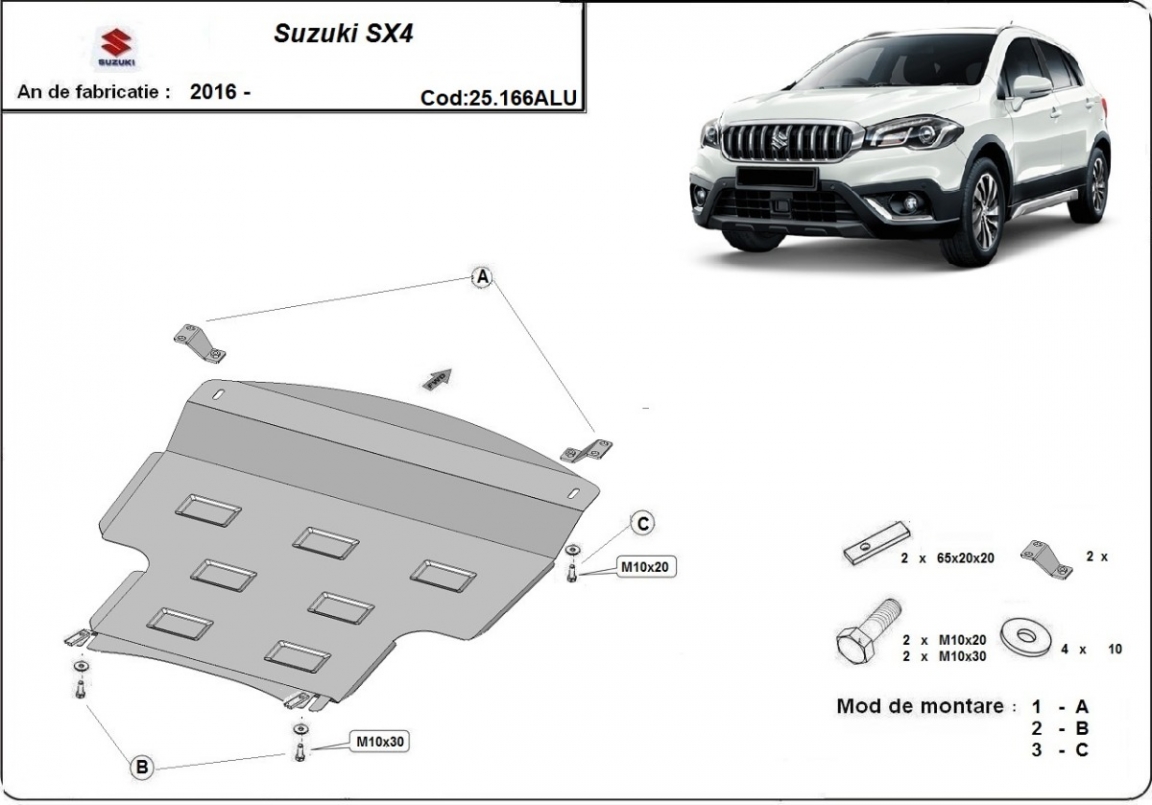 The sump guard is new and fits perfectly for all versions of Suzuki SX4 manufactured between 2013 and 2023. Sump guard for the protection of the: engine, gearbox, radiator Made out of 3 mm thick Aluminium plate. The shields are made of aluminum, but the mounting brackets are made of steel. Screws, nuts, clips, all fastening accessories are included. All sump guards are powder coated to prevent corrosion. The exterior of the sump guard is provided with Aluminium reinforcements, which increases the resistance to impact. |