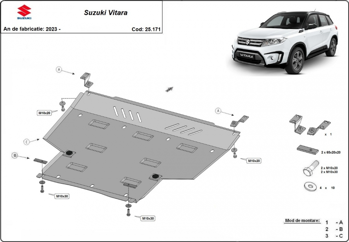 The sump guard is new and fits perfectly for all versions of Suzuki Vitara manufactured between 2023 and 2026. Sump guard for the protection of the: engine, gearbox Made out of 4 mm thick Aluminium plate. The shields are made of aluminum, but the mounting brackets are made of steel. Screws, nuts, clips, all fastening accessories are included. All sump guards are powder coated to prevent corrosion. The exterior of the sump guard is provided with Aluminium reinforcements, which increases the resistance to impact. |