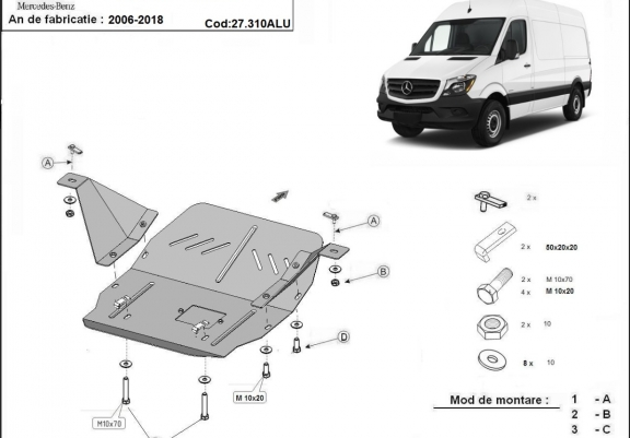 The sump guard is new and fits perfectly for all versions of Mercedes Sprinter manufactured between 2006 and 2018. Sump guard for the protection of the: engine, gearbox Made out of 3 mm thick Aluminium plate. The shields are made of aluminum, but the mounting brackets are made of steel. Screws, nuts, clips, all fastening accessories are included. All sump guards are powder coated to prevent corrosion. The exterior of the sump guard is provided with Aluminium reinforcements, which increases the resistance to impact. |