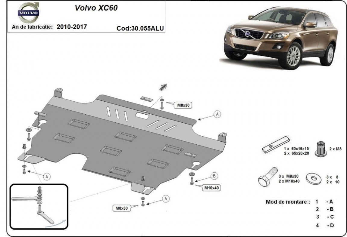 The sump guard is new and fits perfectly for all versions of Volvo XC60 manufactured between 2010 and 2017. Sump guard for the protection of the: engine, gearbox, radiator Made out of 3 mm thick Aluminium plate. The shields are made of aluminum, but the mounting brackets are made of steel. Screws, nuts, clips, all fastening accessories are included. All sump guards are powder coated to prevent corrosion. The exterior of the sump guard is provided with Aluminium reinforcements, which increases the resistance to impact. |