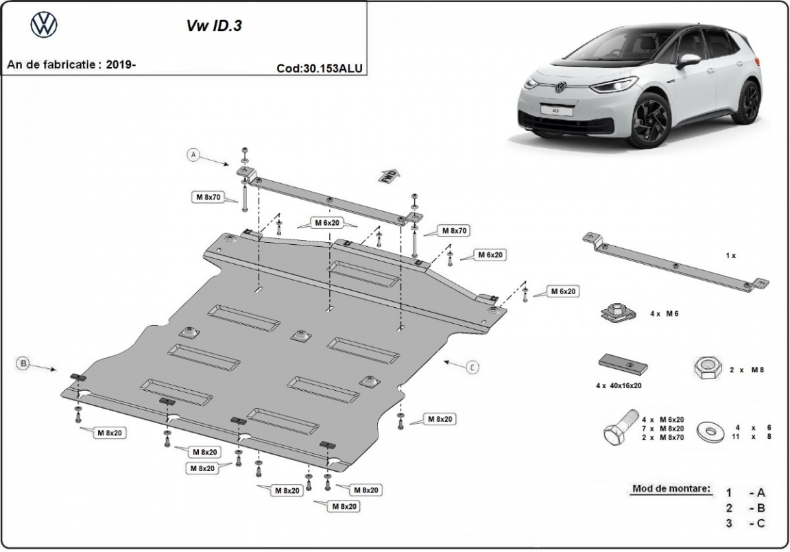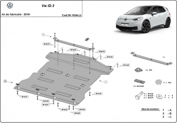 The sump guard is new and fits perfectly for all versions of Volkswagen ID.3 manufactured between 2019 and 2026. Sump guard for the protection of the: engine, gearbox, radiator Made out of 3 mm thick Aluminium plate. The shields are made of aluminum, but the mounting brackets are made of steel. Screws, nuts, clips, all fastening accessories are included. All sump guards are powder coated to prevent corrosion. The exterior of the sump guard is provided with Aluminium reinforcements, which increases the resistance to impact. |