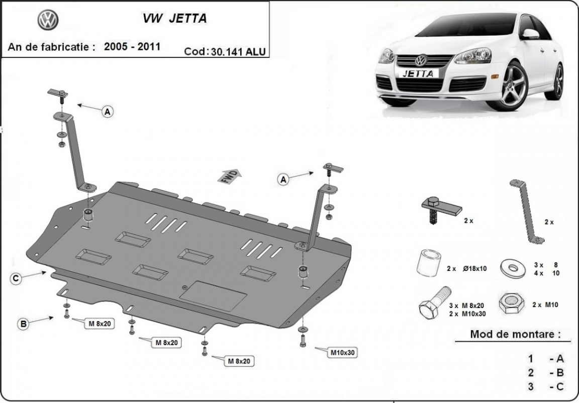The sump guard is new and fits perfectly for all versions of VW Jetta manufactured between 2005 and 2011. Sump guard for the protection of the: engine, gearbox, radiator Made out of 3 mm thick Aluminium plate. The shields are made of aluminum, but the mounting brackets are made of steel. Screws, nuts, clips, all fastening accessories are included. All sump guards are powder coated to prevent corrosion. The exterior of the sump guard is provided with Aluminium reinforcements, which increases the resistance to impact. |