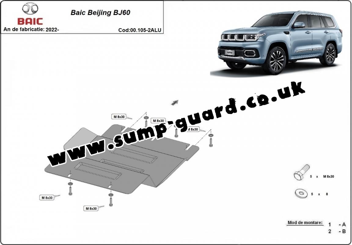 The sump guard is new and fits perfectly for the Baic Beijing BJ60, with the following engine/drive versions: Toate - manufactured between 2022 and 2025. Sump guard for the protection of the: transfer case Made out of 4 mm thick Aluminium plate. The shields are made of aluminum, but the mounting brackets are made of steel. Screws, nuts, clips, all fastening accessories are included. All sump guards are powder coated to prevent corrosion. The exterior of the sump guard is provided with Aluminium reinforcements, which increases the resistance to impact. |