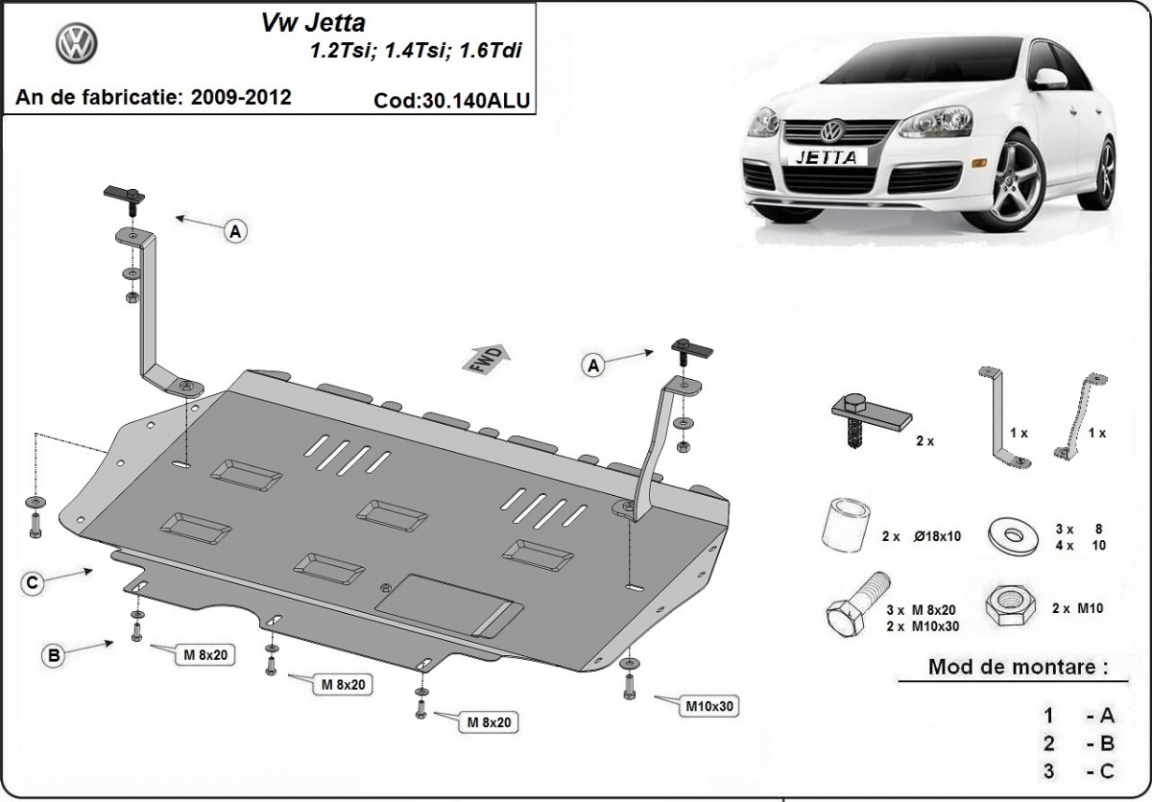 The sump guard is new and fits perfectly for the VW Jetta, with the following engine/drive versions: 1.2Tsi, 1.4Tsi, 1.6Tdi - manufactured between 2009 and 2012. Sump guard for the protection of the: engine, gearbox, radiator Made out of 3 mm thick Aluminium plate. The shields are made of aluminum, but the mounting brackets are made of steel. Screws, nuts, clips, all fastening accessories are included. All sump guards are powder coated to prevent corrosion. The exterior of the sump guard is provided with Aluminium reinforcements, which increases the resistance to impact. |