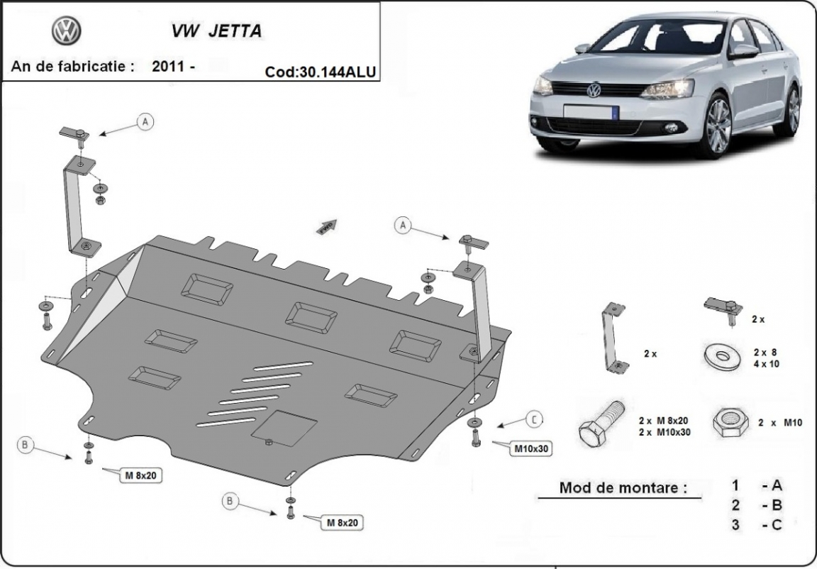 The sump guard is new and fits perfectly for all versions of VW Jetta manufactured between 2011 and 2017. Sump guard for the protection of the: engine, gearbox, radiator Made out of 3 mm thick Aluminium plate. The shields are made of aluminum, but the mounting brackets are made of steel. Screws, nuts, clips, all fastening accessories are included. All sump guards are powder coated to prevent corrosion. The exterior of the sump guard is provided with Aluminium reinforcements, which increases the resistance to impact. |