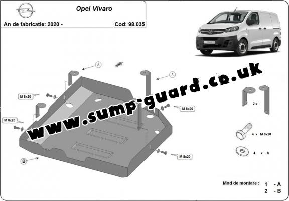 The sump guard is new and fits perfectly for all versions of Opel Vivaro manufactured between 2020 and 2025. Sump guard for the protection of the: fuel tank AdBlue Made out of 2 mm thick Steel plate. Screws, nuts, clips, all fastening accessories are included. All sump guards are powder coated to prevent corrosion. The exterior of the sump guard is provided with Steel reinforcements, which increases the resistance to impact. |