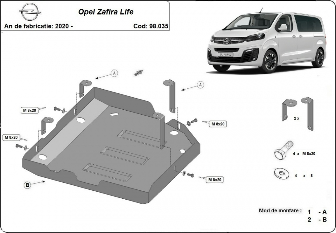 The sump guard is new and fits perfectly for all versions of Opel Zafira Life manufactured between 2020 and 2026. Sump guard for the protection of the: fuel tank AdBlue Made out of 2 mm thick Steel plate. Screws, nuts, clips, all fastening accessories are included. All sump guards are powder coated to prevent corrosion. The exterior of the sump guard is provided with Steel reinforcements, which increases the resistance to impact. |