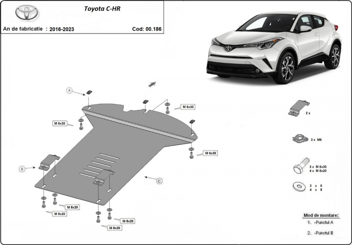 The sump guard is new and fits perfectly for all versions of Toyota C-HR manufactured between 2016 and 2023. Sump guard for the protection of the: Catalytic converter Made out of 2 mm thick Steel plate. Screws, nuts, clips, all fastening accessories are included. All sump guards are powder coated to prevent corrosion. The exterior of the sump guard is provided with Steel reinforcements, which increases the resistance to impact. |