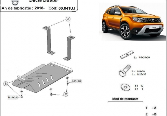 The sump guard is new and fits perfectly for the Dacia Duster, with the following engine/drive versions: 4x4 - manufactured between 2018 and 2024. Sump guard for the protection of the: rear differential Made out of 2 mm thick Steel plate. Screws, nuts, clips, all fastening accessories are included. All sump guards are powder coated to prevent corrosion. The exterior of the sump guard is provided with Steel reinforcements, which increases the resistance to impact. |