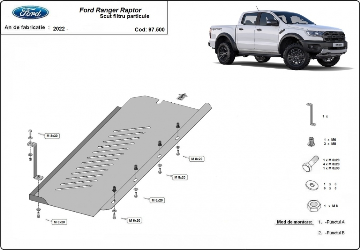 The sump guard is new and fits perfectly for all versions of Ford Ranger Raptor manufactured between 2020 and 2023. Sump guard for the protection of the: DPF , particle filter Made out of 2 mm thick Steel plate. Screws, nuts, clips, all fastening accessories are included. All sump guards are powder coated to prevent corrosion. The exterior of the sump guard is provided with Steel reinforcements, which increases the resistance to impact. |