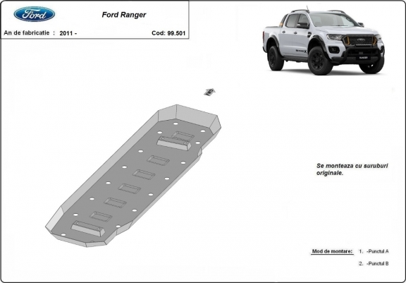 The sump guard is new and fits perfectly for all versions of Ford Ranger manufactured between 2011 and 2023. Sump guard for the protection of the: fuel tank Made out of 2 mm thick Steel plate. Screws, nuts, clips, all fastening accessories are included. All sump guards are powder coated to prevent corrosion. The exterior of the sump guard is provided with Steel reinforcements, which increases the resistance to impact. |