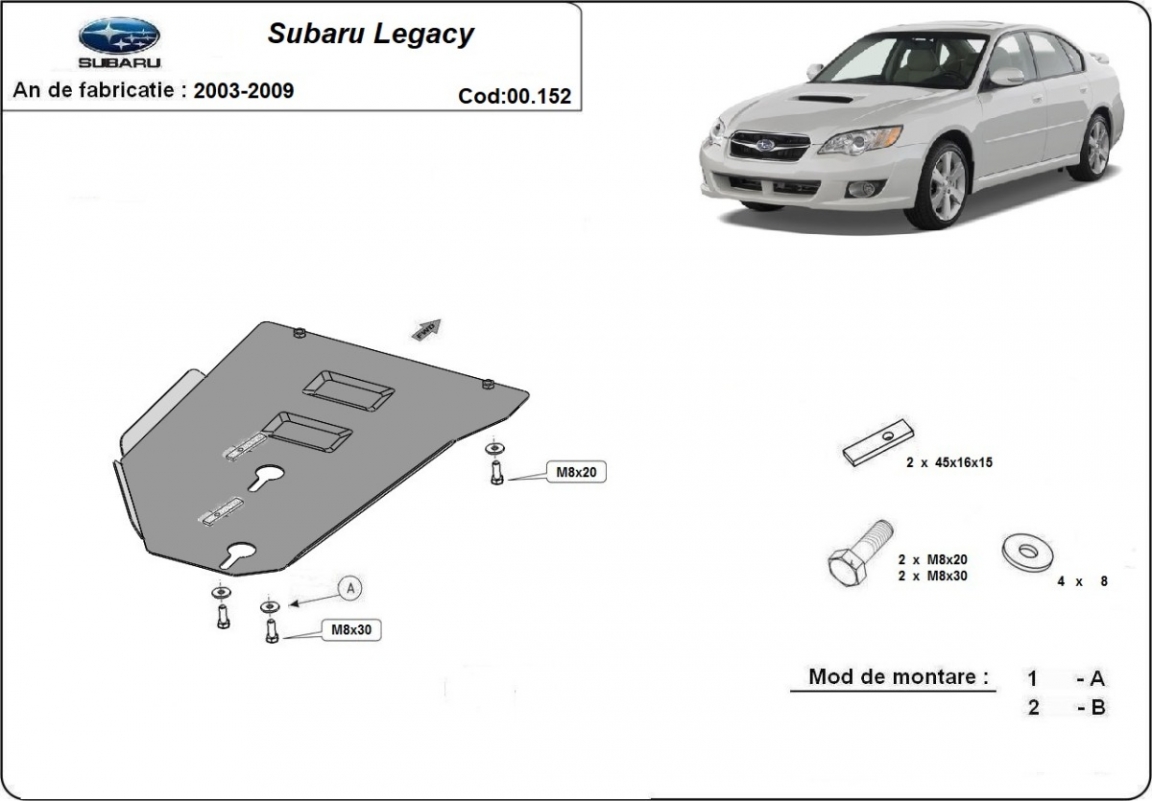 The sump guard is new and fits perfectly for all versions of Subaru Legacy manufactured between 2003 and 2009. Sump guard for the protection of the: gearbox Made out of 2 mm thick Steel plate. Screws, nuts, clips, all fastening accessories are included. All sump guards are powder coated to prevent corrosion. The exterior of the sump guard is provided with Steel reinforcements, which increases the resistance to impact. |