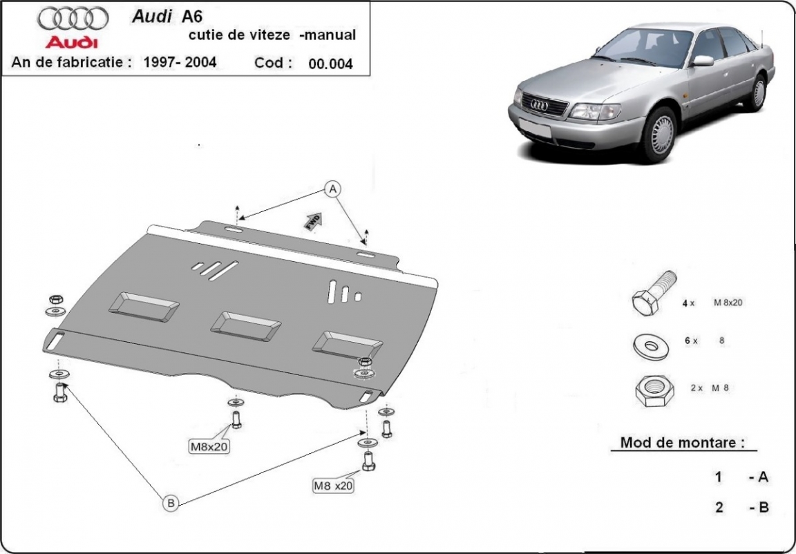 The sump guard is new and fits perfectly for the Audi A6 - manuelle, with the following engine/drive versions: manuala - manufactured between 1997 and 2004. Sump guard for the protection of the: gearbox Made out of 2 mm thick Steel plate. Screws, nuts, clips, all fastening accessories are included. All sump guards are powder coated to prevent corrosion. The exterior of the sump guard is provided with Steel reinforcements, which increases the resistance to impact. |