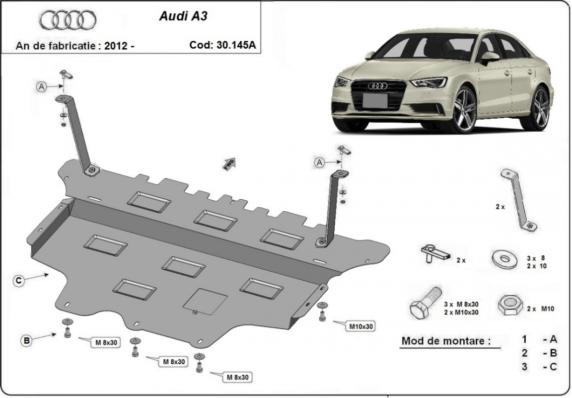The sump guard is new and fits perfectly for all versions of Audi A3 manufactured between 2012 and 2020. Sump guard for the protection of the: engine, gearbox, radiator, front bumper Made out of 2 mm thick Steel plate. Screws, nuts, clips, all fastening accessories are included. All sump guards are powder coated to prevent corrosion. The exterior of the sump guard is provided with Steel reinforcements, which increases the resistance to impact. |