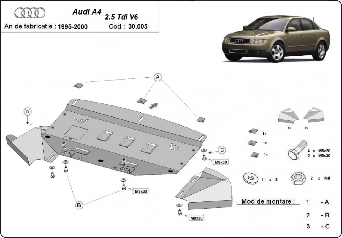 The sump guard is new and fits perfectly for the Audi A4 B5, with the following engine/drive versions: petrol V6, 2.6, 2.8, diesel - 2.5 D - manufactured between 1997 and 2000. Sump guard for the protection of the: engine, radiator, front bumper It has an opening for the oil sump, so it's removal won't be necessary to change the oil. Made out of 2 mm thick Steel plate. Screws, nuts, clips, all fastening accessories are included. All sump guards are powder coated to prevent corrosion. The exterior of the sump guard is provided with Steel reinforcements, which increases the resistance to impact. |