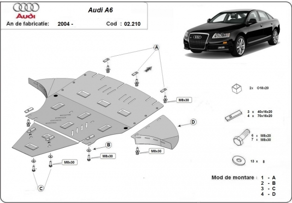 The sump guard is new and fits perfectly for all versions of Audi A6 avec laterale manufactured between 2004 and 2011. Sump guard for the protection of the: engine, gearbox, radiator, front bumper Made out of 2 mm thick Steel plate. Screws, nuts, clips, all fastening accessories are included. All sump guards are powder coated to prevent corrosion. The exterior of the sump guard is provided with Steel reinforcements, which increases the resistance to impact. |