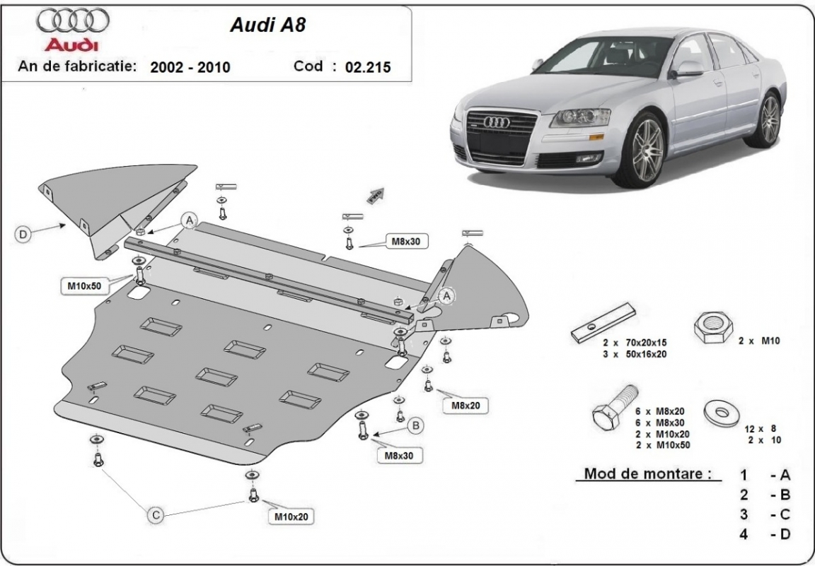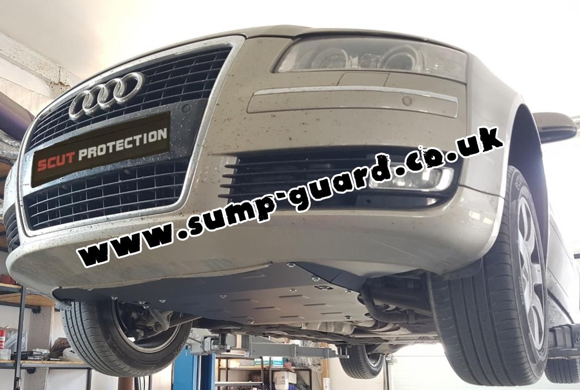 The sump guard is new and fits perfectly for all versions of Audi A8 manufactured between 2002 and 2010. Sump guard for the protection of the: engine, gearbox, radiator, front bumper Made out of 2 mm thick Steel plate. Screws, nuts, clips, all fastening accessories are included. All sump guards are powder coated to prevent corrosion. The exterior of the sump guard is provided with Steel reinforcements, which increases the resistance to impact. |