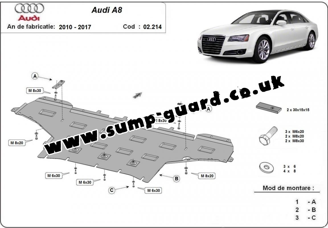 The sump guard is new and fits perfectly for all versions of Audi A8 manufactured between 2010 and 2017. Sump guard for the protection of the: engine, radiator Made out of 2 mm thick Steel plate. Screws, nuts, clips, all fastening accessories are included. All sump guards are powder coated to prevent corrosion. The exterior of the sump guard is provided with Steel reinforcements, which increases the resistance to impact. |