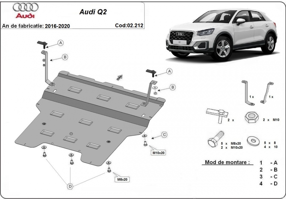 The sump guard is new and fits perfectly for all versions of Audi Q2 manufactured between 2016 and 2020. Sump guard for the protection of the: engine, gearbox, radiator Made out of 2 mm thick Steel plate. Screws, nuts, clips, all fastening accessories are included. All sump guards are powder coated to prevent corrosion. The exterior of the sump guard is provided with Steel reinforcements, which increases the resistance to impact. |