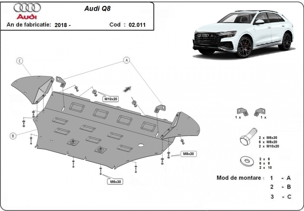 The sump guard is new and fits perfectly for all versions of Audi Q8 manufactured between 2018 and 2020. Sump guard for the protection of the: engine, radiator, front bumper Made out of 2 mm thick Steel plate. Screws, nuts, clips, all fastening accessories are included. All sump guards are powder coated to prevent corrosion. The exterior of the sump guard is provided with Steel reinforcements, which increases the resistance to impact. |