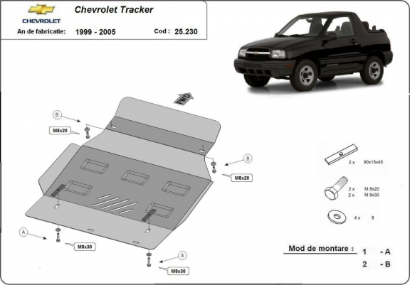 The sump guard is new and fits perfectly for all versions of Chevrolet Tracker manufactured between 1999 and 2005. Sump guard for the protection of the: engine Made out of 3 mm thick Steel plate. Screws, nuts, clips, all fastening accessories are included. All sump guards are powder coated to prevent corrosion. The exterior of the sump guard is provided with Steel reinforcements, which increases the resistance to impact. |