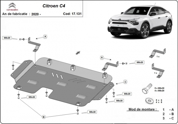 The sump guard is new and fits perfectly for all versions of Citroen C4 manufactured between 2020 and 2026. Sump guard for the protection of the: engine, gearbox, radiator Made out of 2 mm thick Steel plate. Screws, nuts, clips, all fastening accessories are included. All sump guards are powder coated to prevent corrosion. The exterior of the sump guard is provided with Steel reinforcements, which increases the resistance to impact. |