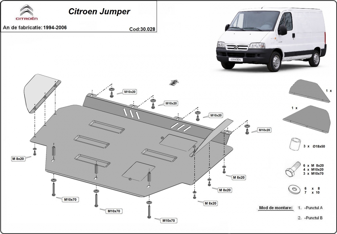 The sump guard is new and fits perfectly for all versions of Citroen Jumper manufactured between 1995 and 2006. Sump guard for the protection of the: engine, gearbox, radiator It has an opening for the oil sump, so it's removal won't be necessary to change the oil. Made out of 2 mm thick Steel plate. Screws, nuts, clips, all fastening accessories are included. All sump guards are powder coated to prevent corrosion. The exterior of the sump guard is provided with Steel reinforcements, which increases the resistance to impact. |