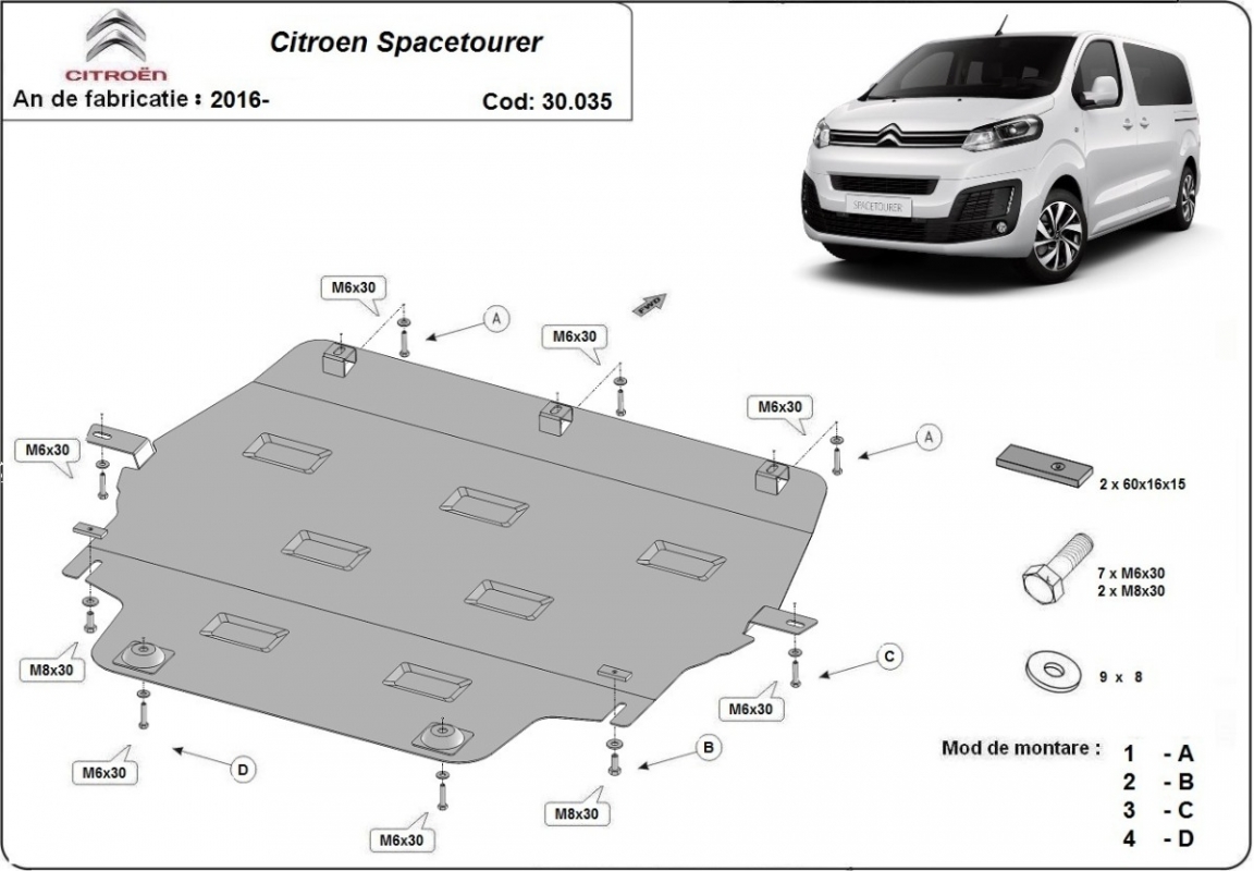 The sump guard is new and fits perfectly for all versions of Citroen Spacetourer manufactured between 2016 and 2026. Sump guard for the protection of the: engine, gearbox, radiator Made out of 2 mm thick Steel plate. Screws, nuts, clips, all fastening accessories are included. All sump guards are powder coated to prevent corrosion. The exterior of the sump guard is provided with Steel reinforcements, which increases the resistance to impact. |