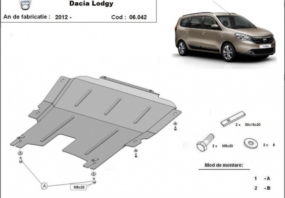 The sump guard is new and fits perfectly for all versions of Dacia Lodgy manufactured between 2012 and 2026. Sump guard for the protection of the: engine, gearbox Made out of 2 mm thick Steel plate. Screws, nuts, clips, all fastening accessories are included. All sump guards are powder coated to prevent corrosion. The exterior of the sump guard is provided with Steel reinforcements, which increases the resistance to impact. |