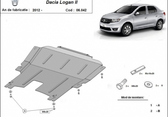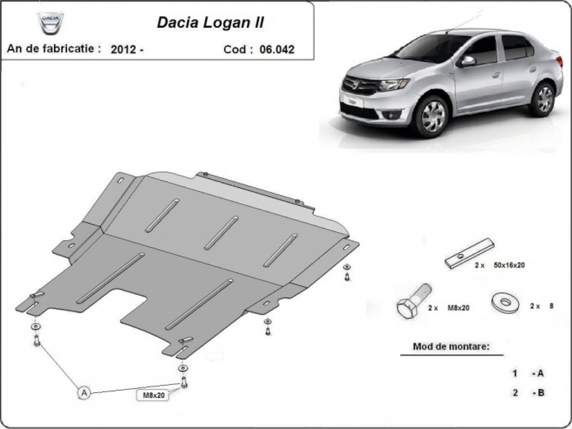 The sump guard is new and fits perfectly for all versions of Dacia Logan 2 manufactured between 2012 and 2020. Sump guard for the protection of the: engine, gearbox Made out of 2 mm thick Steel plate. Screws, nuts, clips, all fastening accessories are included. All sump guards are powder coated to prevent corrosion. The exterior of the sump guard is provided with Steel reinforcements, which increases the resistance to impact. |