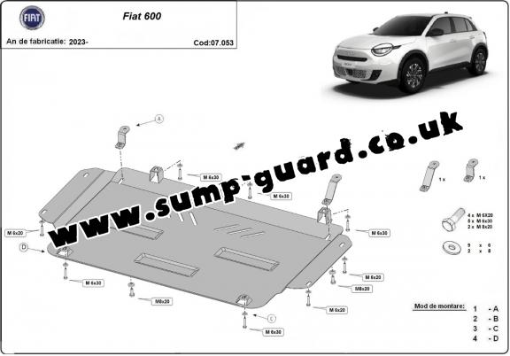 The sump guard is new and fits perfectly for all versions of Fiat 600 manufactured between 2023 and 2025. Sump guard for the protection of the: engine, gearbox, radiator Made out of 2 mm thick Steel plate. Screws, nuts, clips, all fastening accessories are included. All sump guards are powder coated to prevent corrosion. The exterior of the sump guard is provided with Steel reinforcements, which increases the resistance to impact. |