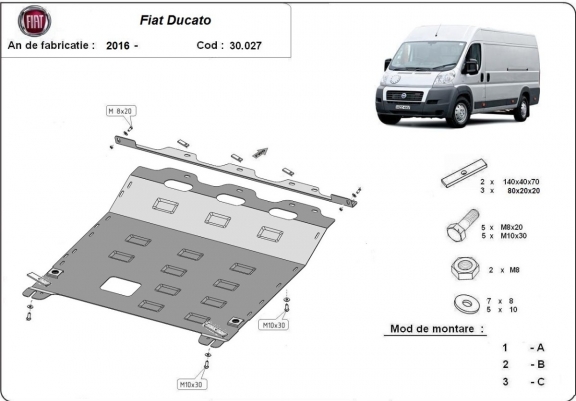 The sump guard is new and fits perfectly for all versions of Fiat Ducato manufactured between 2016 and 2026. Sump guard for the protection of the: engine, gearbox, radiator Made out of 2.5 mm thick Steel plate. Screws, nuts, clips, all fastening accessories are included. All sump guards are powder coated to prevent corrosion. The exterior of the sump guard is provided with Steel reinforcements, which increases the resistance to impact. |