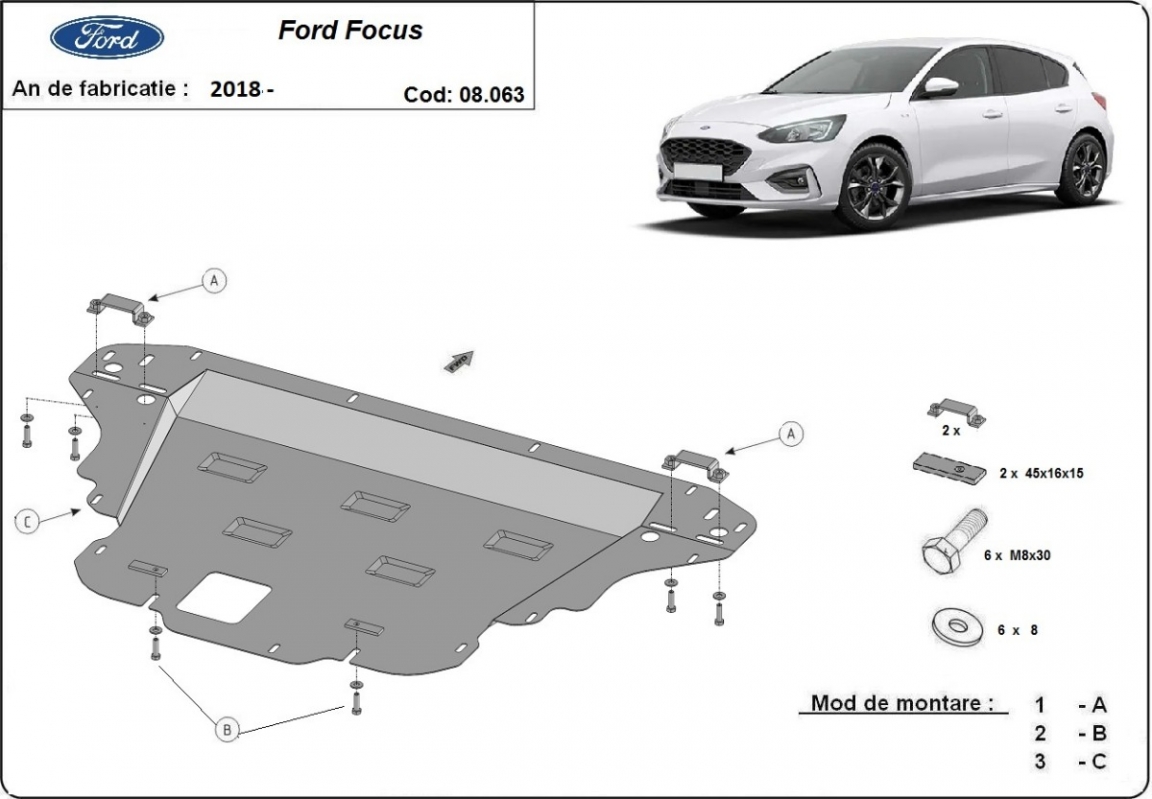 The sump guard is new and fits perfectly for all versions of Ford Focus 4 manufactured between 2018 and 2026. Sump guard for the protection of the: engine, gearbox, radiator, front bumper Made out of 2 mm thick Steel plate. Screws, nuts, clips, all fastening accessories are included. All sump guards are powder coated to prevent corrosion. The exterior of the sump guard is provided with Steel reinforcements, which increases the resistance to impact. |