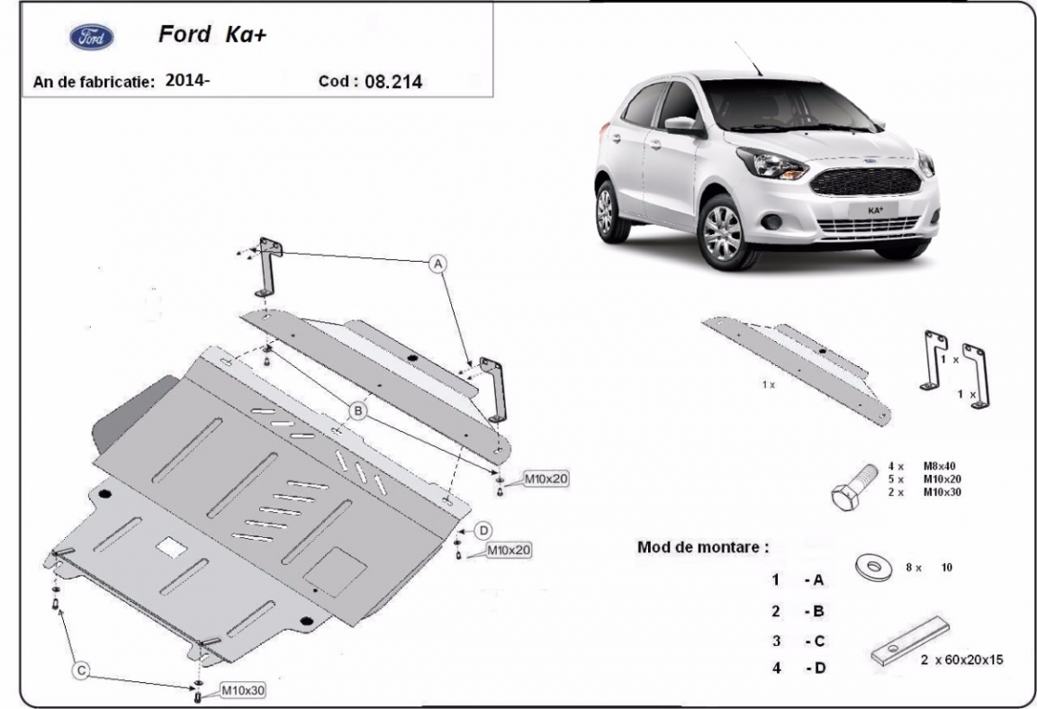 The sump guard is new and fits perfectly for all versions of Ford KA manufactured between 2014 and 2020. Sump guard for the protection of the: engine, gearbox, radiator, front bumper It has an opening for the oil sump, so it's removal won't be necessary to change the oil. Made out of 2 mm thick Steel plate. Screws, nuts, clips, all fastening accessories are included. All sump guards are powder coated to prevent corrosion. The exterior of the sump guard is provided with Steel reinforcements, which increases the resistance to impact. |