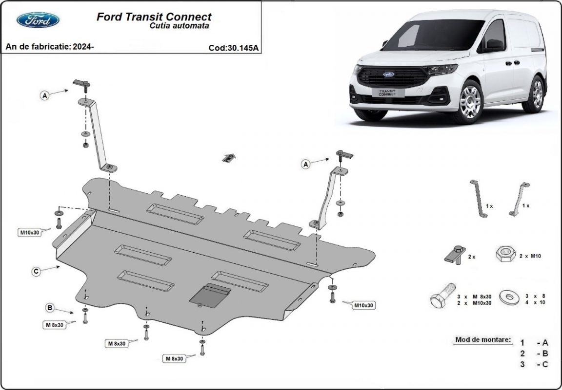 The sump guard is new and fits perfectly for all versions of Ford Transit Connect manufactured between 2024 and 2026. Sump guard for the protection of the: engine, gearbox, radiator, front bumper Made out of 2 mm thick Steel plate. Screws, nuts, clips, all fastening accessories are included. All sump guards are powder coated to prevent corrosion. The exterior of the sump guard is provided with Steel reinforcements, which increases the resistance to impact. |